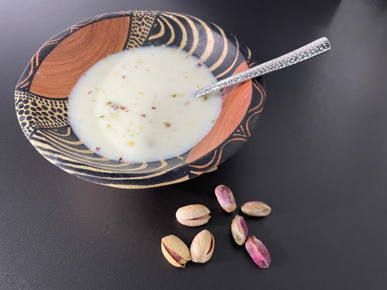 Ajoblanco de pistachos con langostinos