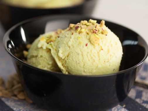 - Vuelva a triturar 10 segundos y vierta el helado en un recipiente hermético. Conserve en el congelador. Sirva en bolas presentadas en copas individuales y espolvoree con los pistachos troceados restantes.